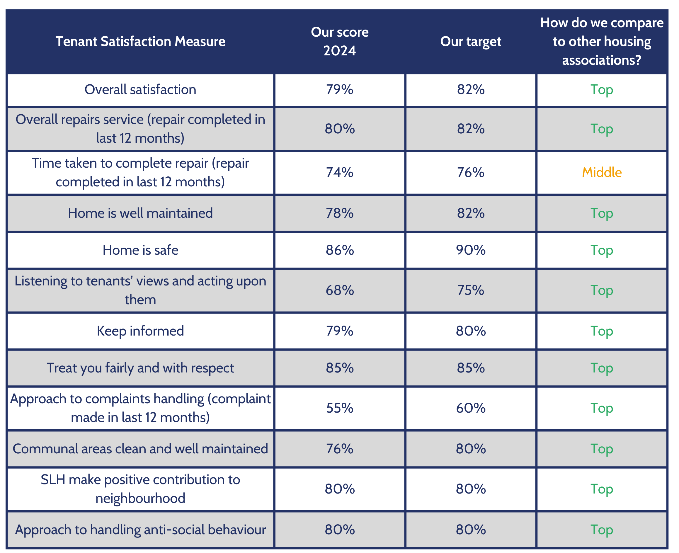 There are 12 of these TSMs. They cover a range of subjects such as repairs, complaints, being listened to and our approach to community safety.