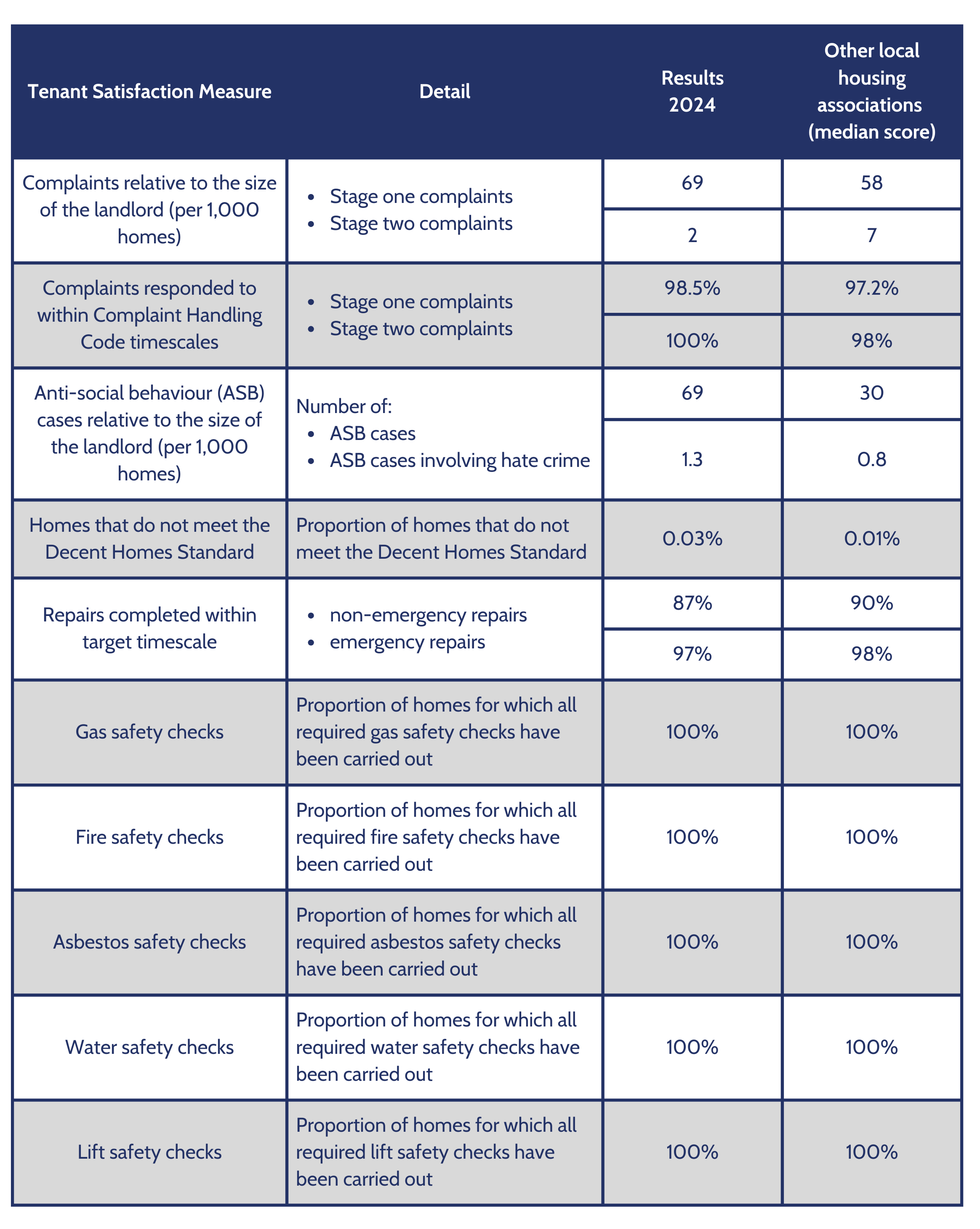 The other 10 measures are reported directly by us, from information we collect throughout the year. These are things like number of complaints, number of anti-social behaviour reports, how long we take to complete repairs, and how we complete essential health and safety checks.