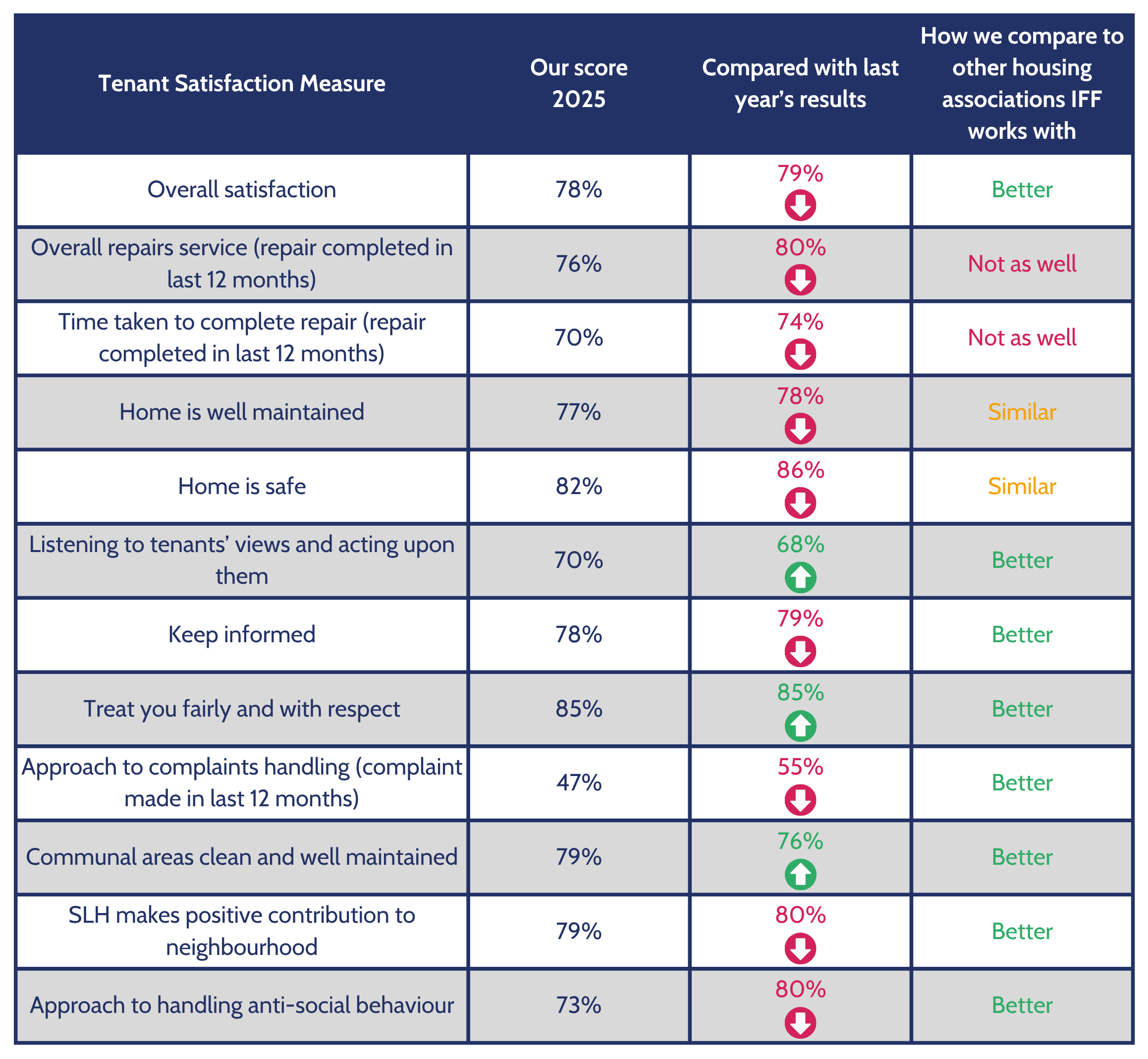Performance highlights areas of strength, such as SLH treating you fairly and with respect, perceptions of a safe home, clean and well-maintained communal areas and our contribution to the neighbourhoods.